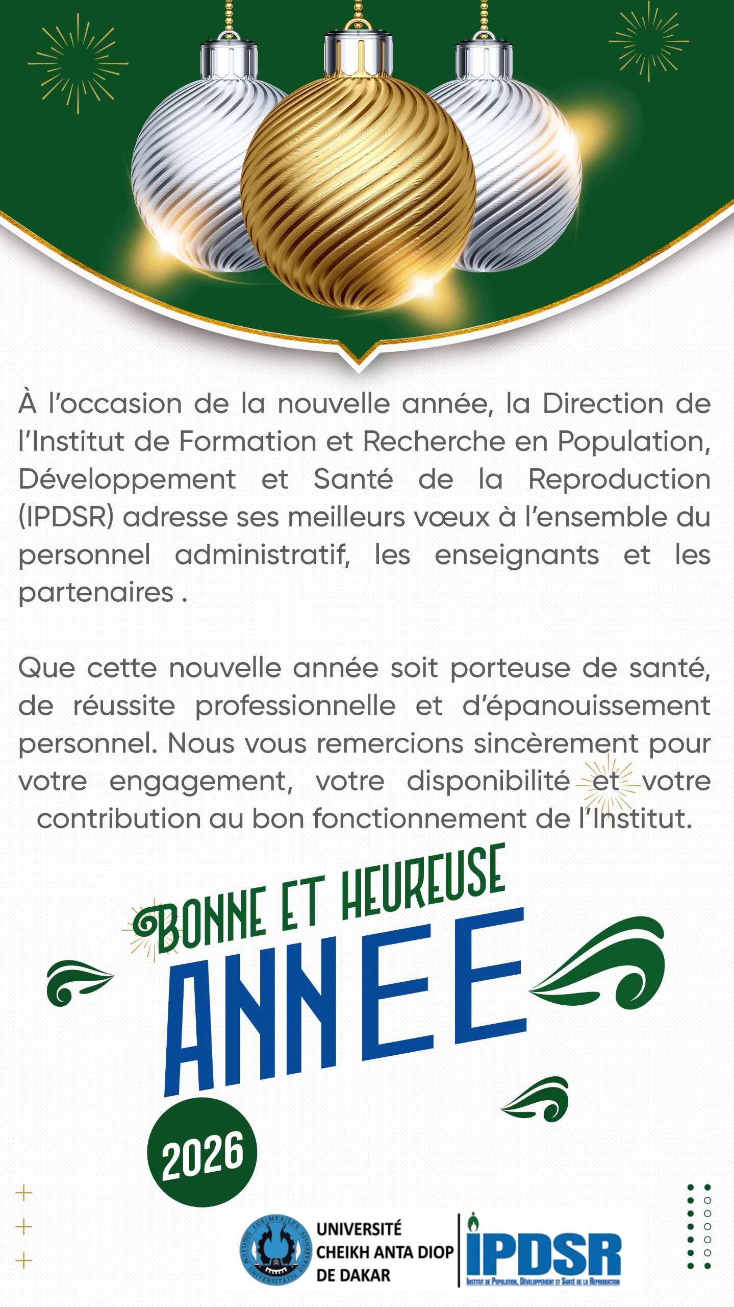 L’IPDSR est un Institut d’Université créé le 26 Février 1999 par délibération de l’Assemblée de l’Université dans le but de combler le déficit en connaissances sur les questions de population, de développement et de santé de la reproduction. Sis au Campus BRGM à l’Université Cheikh Anta Diop, il est le fruit du partenariat entre l’Université Cheikh Anta Diop, le Fonds des Nations Unies